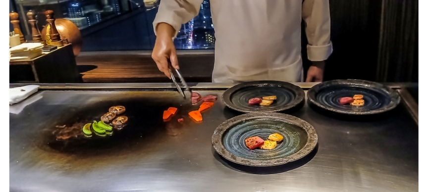 At times, chefs’ performance overshadows cuisine itself; but discerning diners appreciate both delicate, skilled preparation of ingredients and joy of savouring Japanese delights cooked over hot plate.