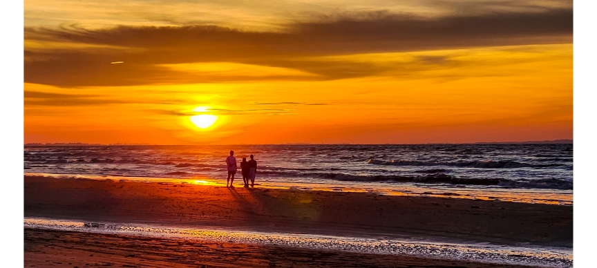 Walk along beach … soft, fine sand underfoot … cooling breezes amidst warm, humid evening … setting sun … vibrant colours against shoreline …