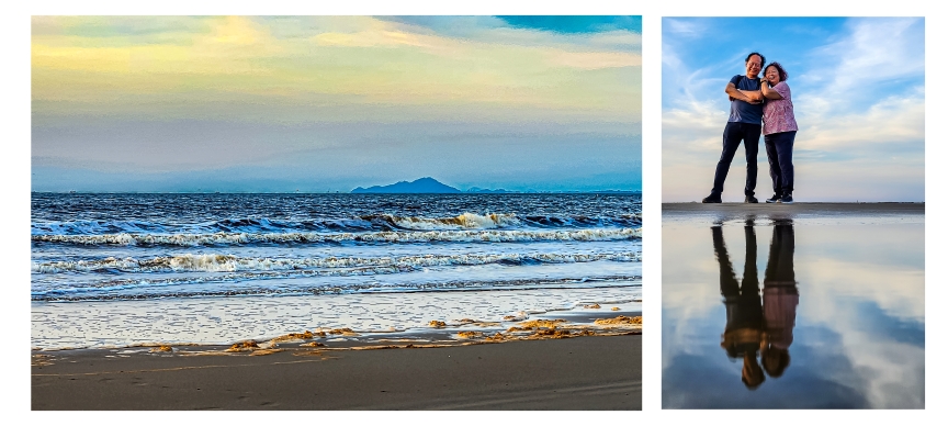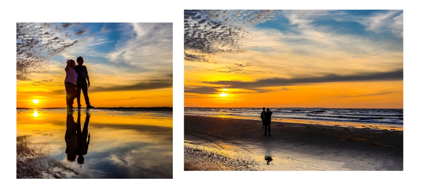Sunny hues, gentle waves … orange-red evening skies, scattered clouds … culminating in blue-purple skies at dusk.