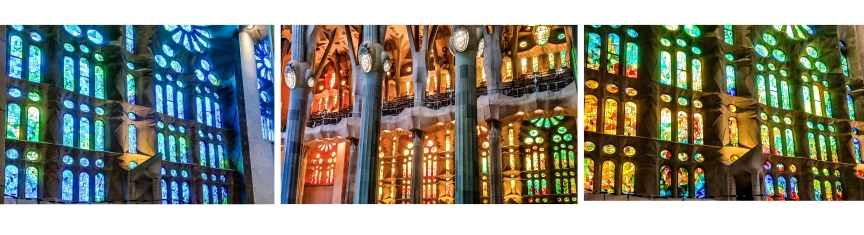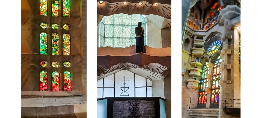 Open spaces … blends of architecture, sculpture, symbolism … airy, high vaulted ceilings … filled with colours when sun lights up large stained-glass windows …
