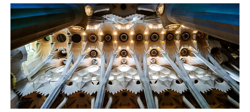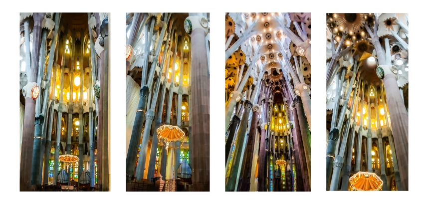 Tree-trunk columns, unique Gaudi design; support decorative ceilings … designed to resemble trees and branches … forest with canopy overhead …